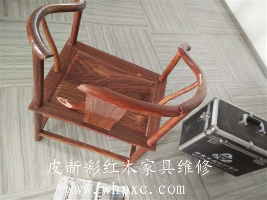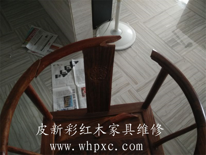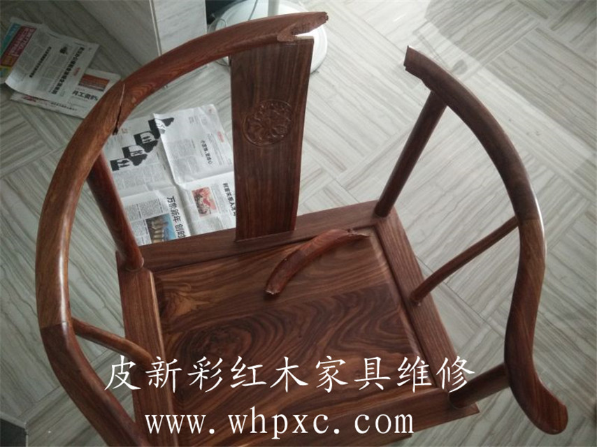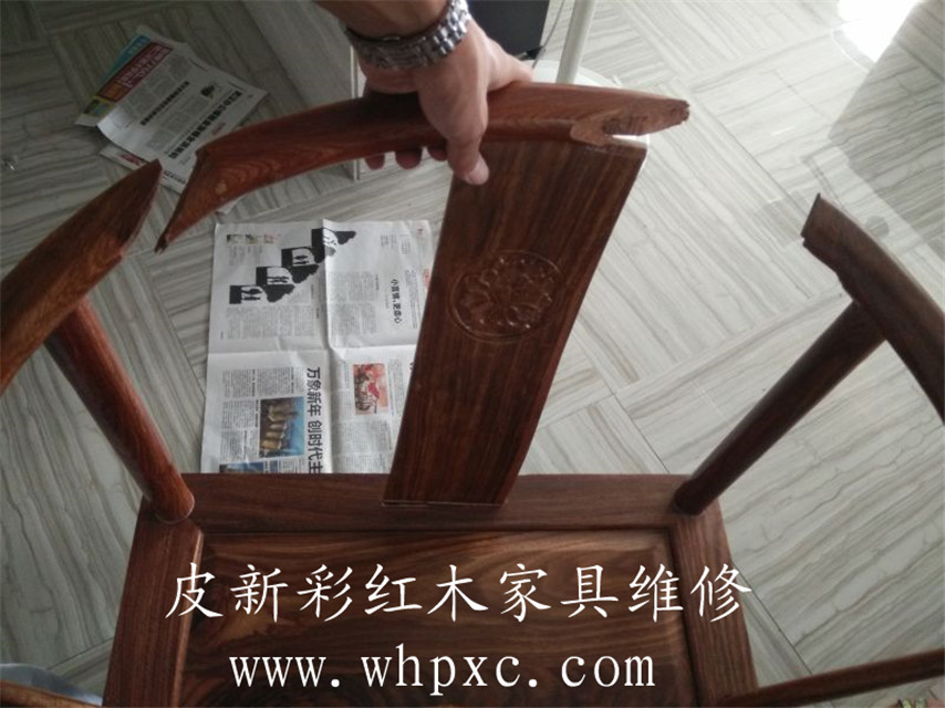 這個紅木圈椅已經(jīng)斷成3節(jié),需要先用膠固定再打丁加固,用鋸末填好縫隙,再上色描紋,修完以后又完好如初,維修費用300元,2小時搞定,皮新彩紅木家具維修熱線:13995508166