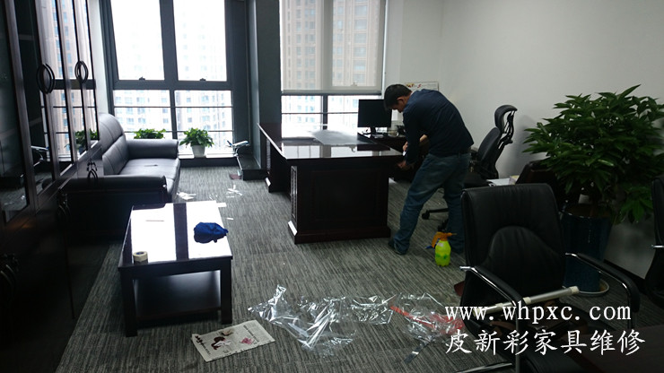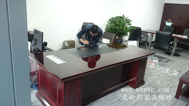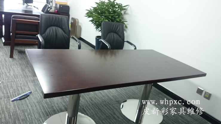 長江水利委員會家具貼膜維修工程,嶄新的辦公家具漆膜太薄,水杯一燙漆面就發白,做衛生水沒有擦干凈也發白,我們給出兩種方案,貼膜和噴漆,還是貼膜效果好又環保,皮新彩辦公家具維修13995508166