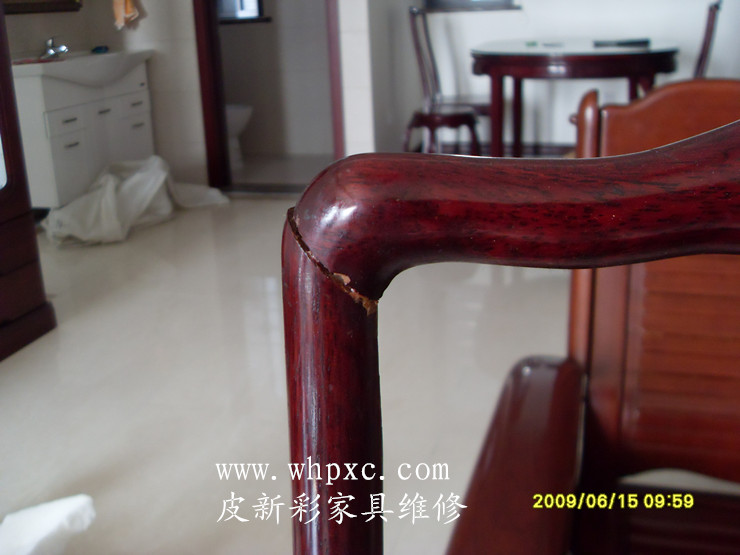 這是做了油漆的假紅木的,時間長了出現開裂,這種木頭比較硬打釘容易炸裂最好是上膠,打釘之前先鉆孔,用鋸末填縫比較好,皮新彩家具補漆電話:13995508166